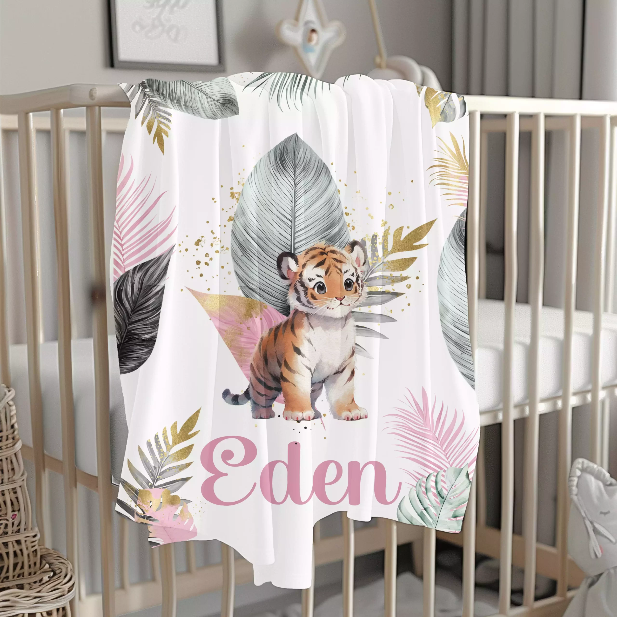 - Design enchanteur : L’imprimé animaux de la savane avec des feuilles dorées et roses apporte une touche de magie à cette couverture. Chaque détail est soigneusement brodé, faisant de cette couverture un véritable chef-d’œuvre décoratif pour la chambre de votre bébé.